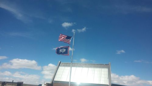 Sunday, we ended up in Rawlins, WY, another I-80 truckstop. You would think that 100 some odd miles on an interstate is a piece of cake. Well, not in a high profile vehicle with 40 mph wind gusts. Seems like all of Wyoming is like that. Those flags at the rest area were at attention and the wind direction was pretty much a direct crosswind making a fairly straight drive a white knuckler.