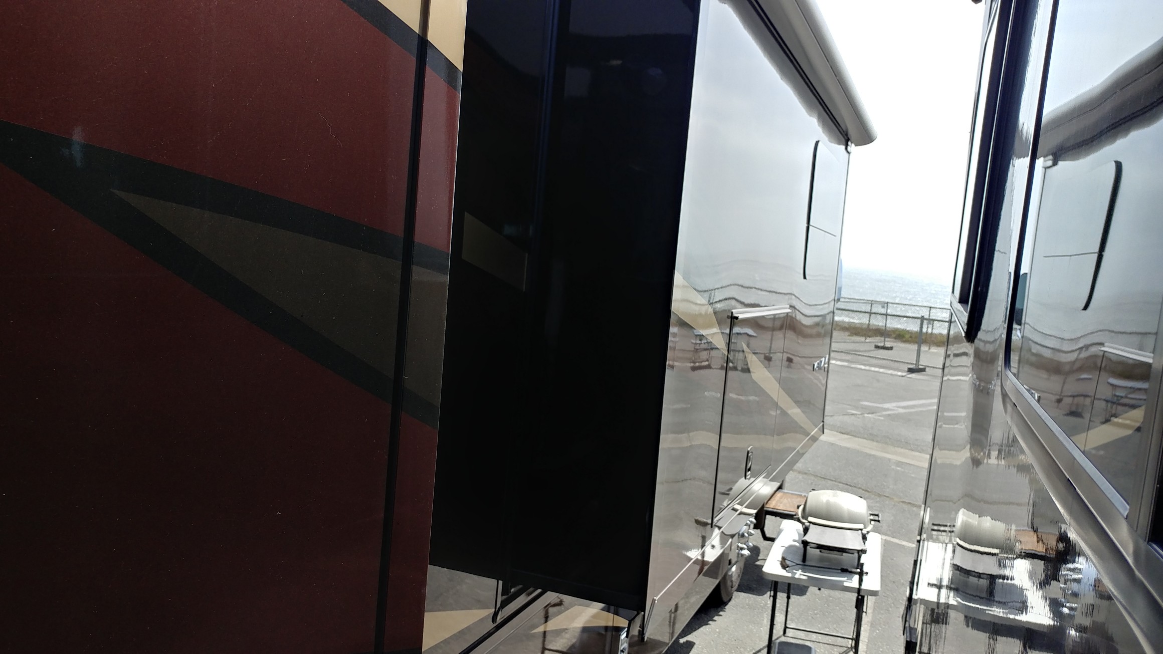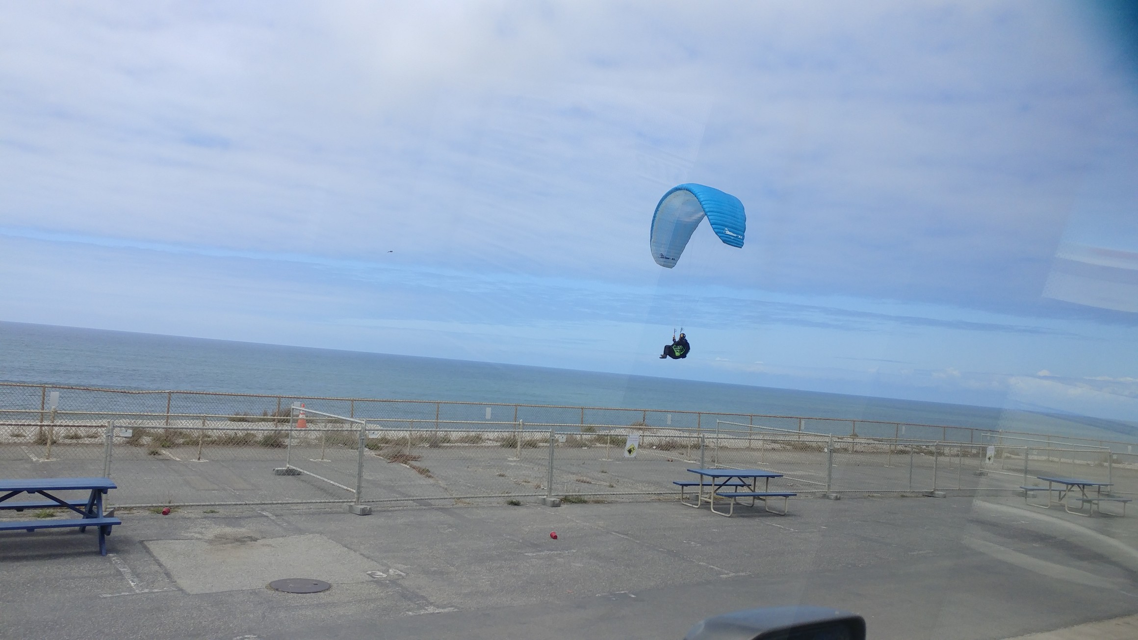 RV Talk: We’re in San Francisco RV Resort, a Thousand Trails “Collection” park, an Encore member. So instead of whatever price they charge everyone else, it costs $20 a night to have your windshield facing the ocean. And a constant 5-15mph “breeze” off the water – the windsock on the cliff is almost never without air and usually at a 90-120° angle off the water – the wind whips up the cliff, providing good conditions for new-age aviators: