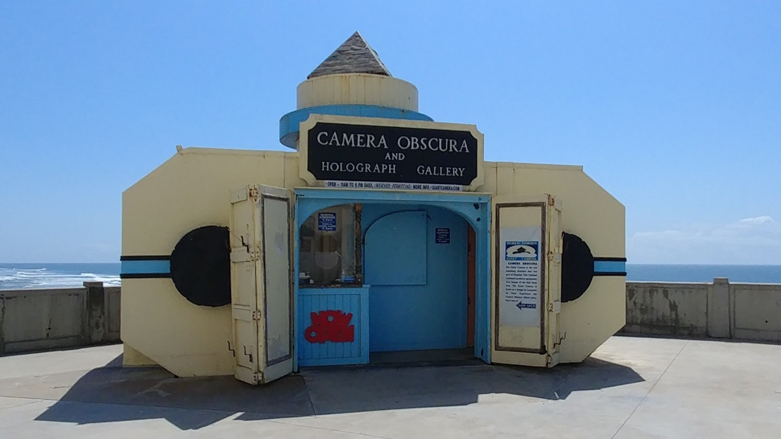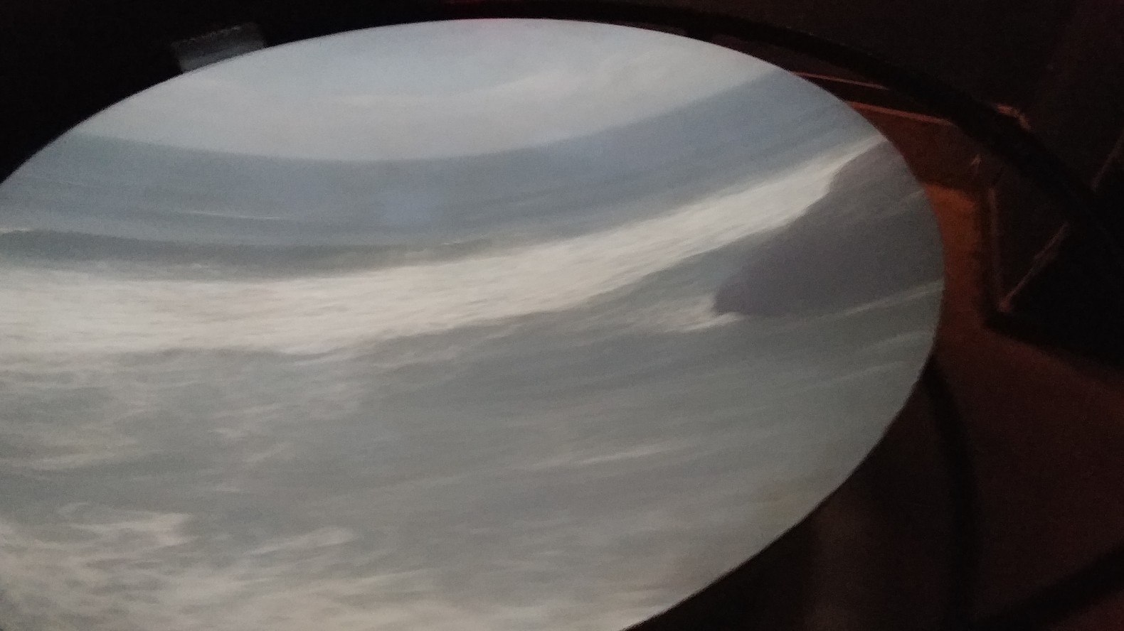 which was pretty cool. We got a 33% discount for being seniors. Paid two bucks apiece. We were the only ones inside, with Luna, in a 15′ diameter room. The guy who runs the place, a US Parks employee with quite a title, ticket-taker and giant camera operator, turned on the camera. That prism on top rotates and houses a lens