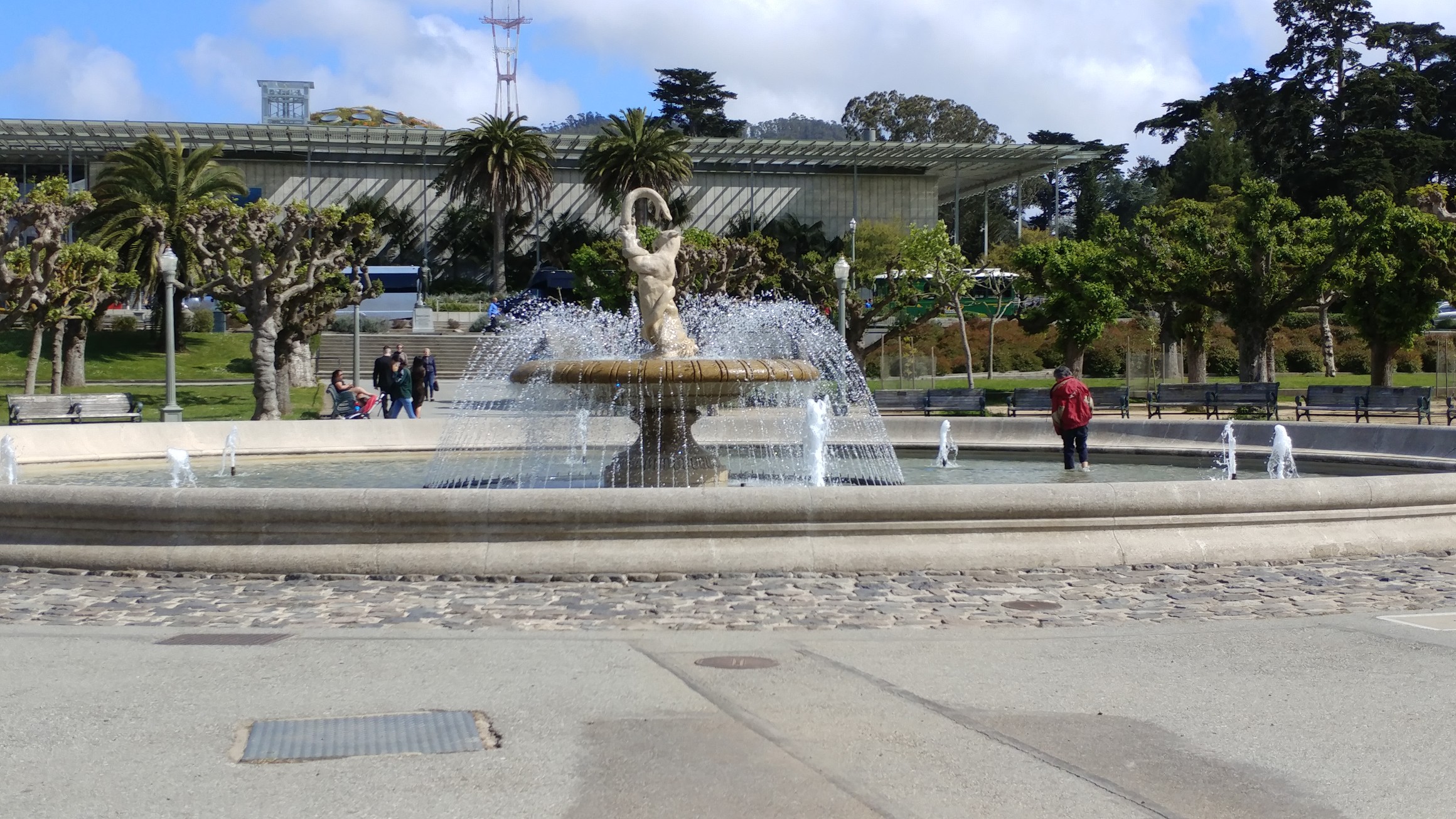 Behind that fountain is the California Academy of Science. We considered coming back with our Luna for that, but their planetarium show this month is about underwater life. What’s with that? I want to see stars and space stuff, or Rick Wakeman in concert, or a Floyd Laser Light Show. We’ll pass. Looking north from that fountain, another fountain: