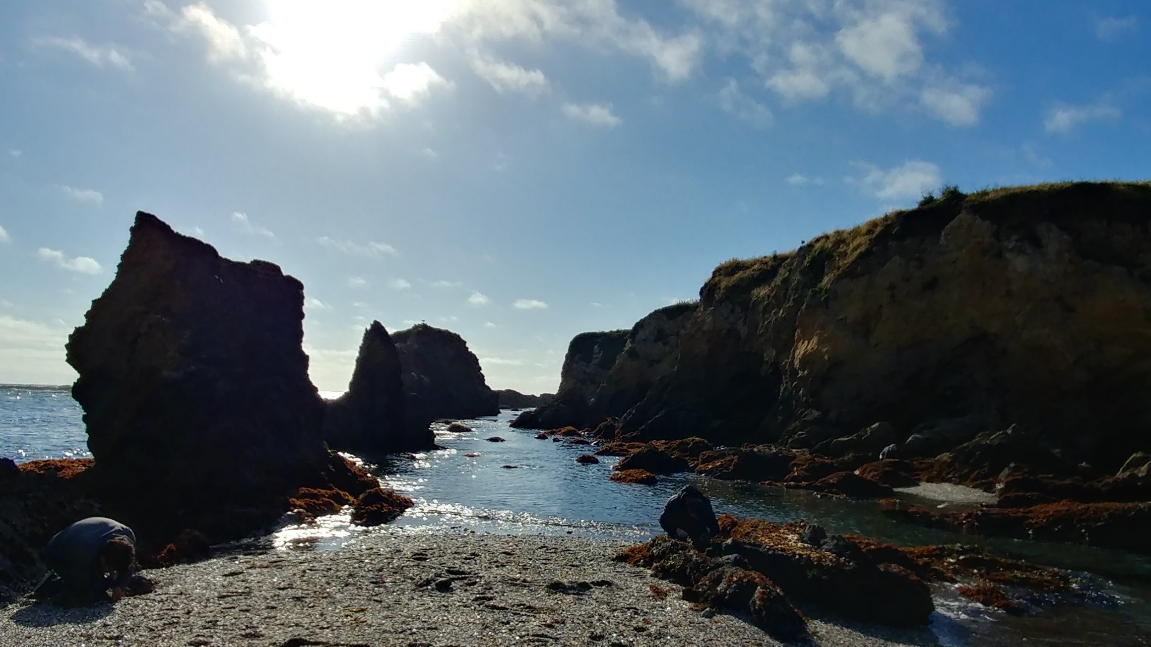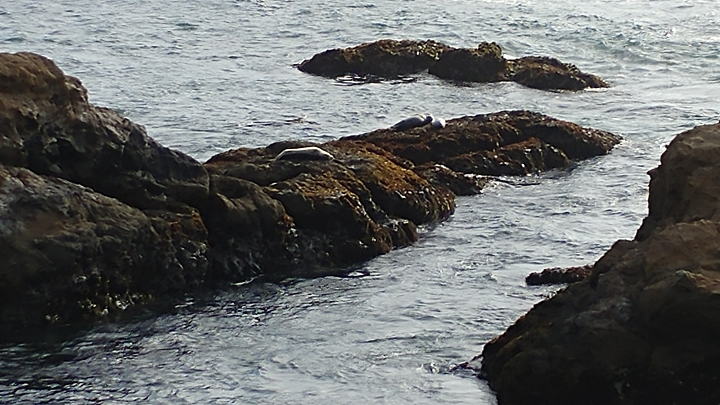 On the walk back over a few more cliffs, I needed to stop and sit on a bench. We looked down on another beach and another load of huge rocks out in the water. I noticed a movement on one of the rocks and then saw the shapes of seals. It looked like an adult and playful younger seal on the right.