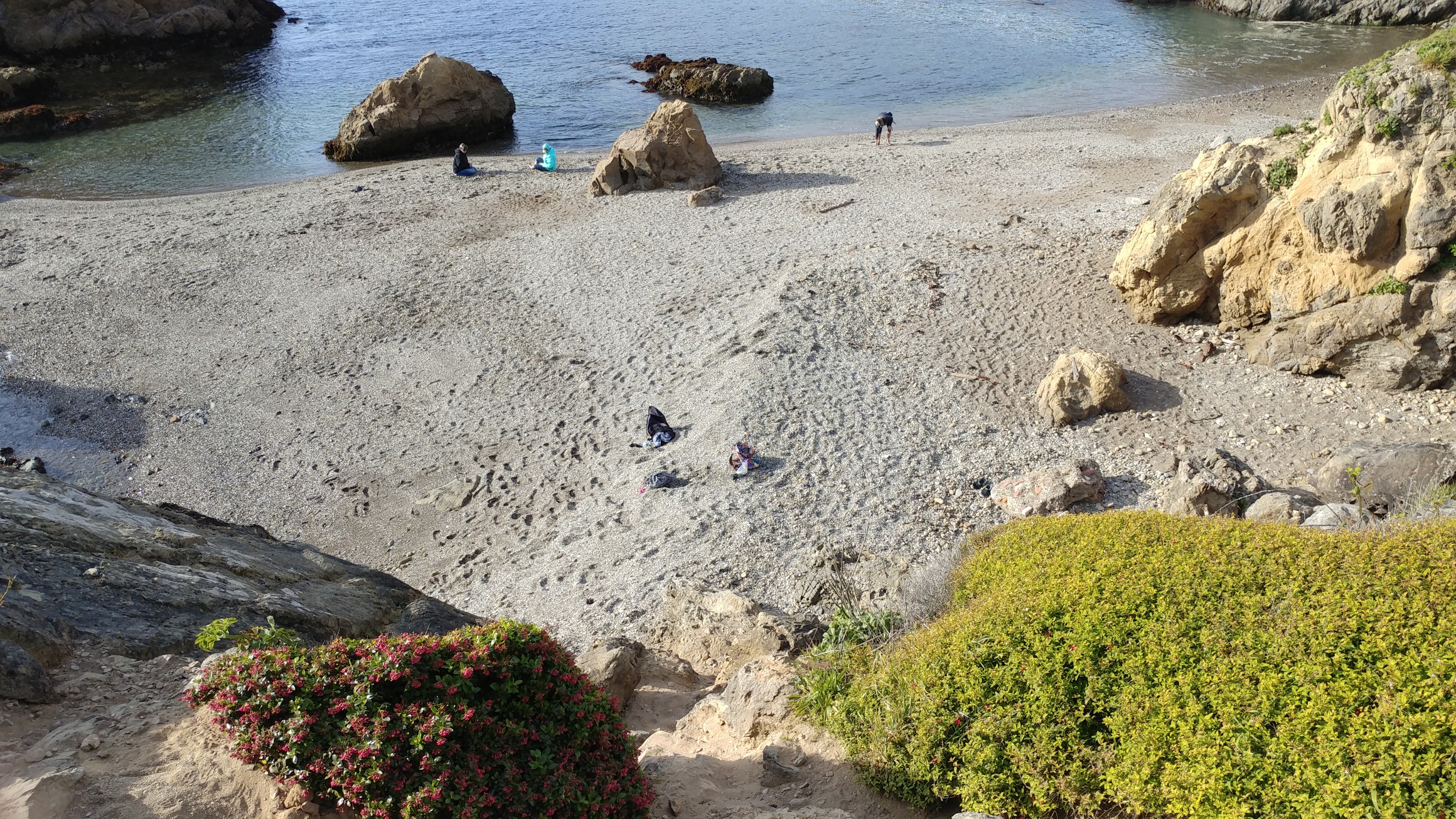 Today, those beaches have been combed over by a million tourists and unless some new pieces wash ashore, only the tiniest chunks with any color remain. Still, we spent four hours on about a hundred foot semicircle of beach with a few other collectors. Andrea’s magnetic bracelet was covered with sand-sized pieces of iron, perhaps the remains of an Edsel. Getting down to the beach is another thing but trails, of a sort, descend to the beach. Looking down a sort-of trail: