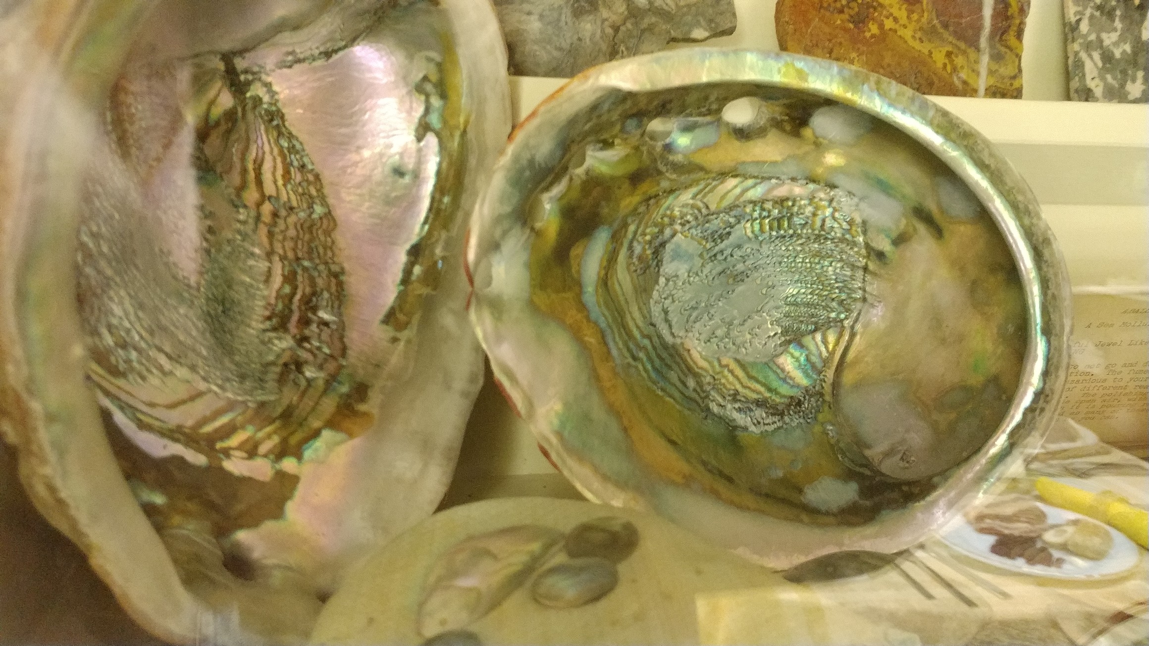 I really liked those rocks. I had found a couple on the beach with intricate striations, but what I found most interesting on the beach were small pieces of abalone shells. Larry had some whoppers: